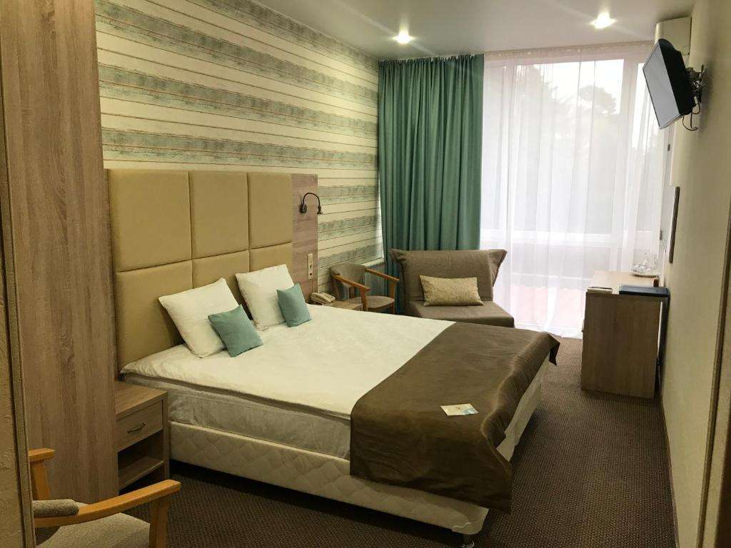 Просторный комфортабельный номер в классическом стиле с большой кроватью размера king-size. Из панорамных окон открывается вид на море или парк Дендрарий. В номере: телевизор, кондиционер, телефон, мини-холодильник, туалетная комната с душевой кабиной, фен, спутниковое ТВ. Для Вашего удобства в номере: халат, тапочки, косметические принадлежности, сумка и полотенца для бассейна и пляжа.