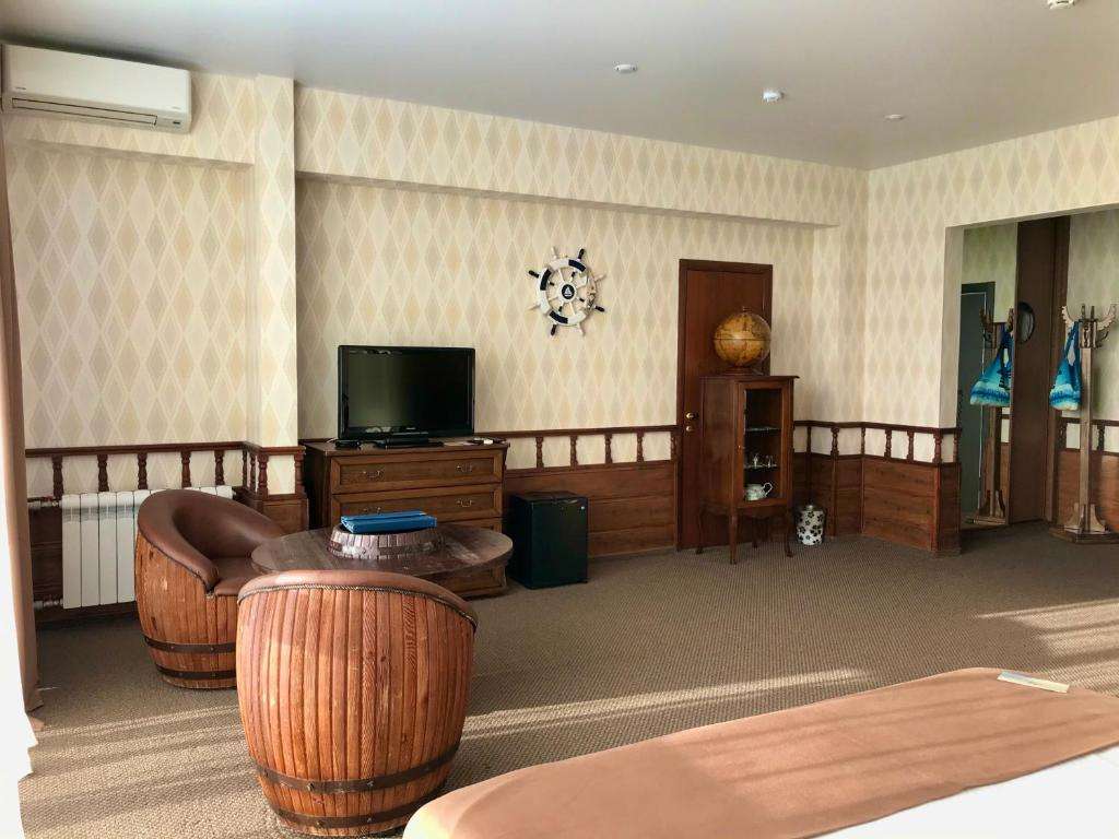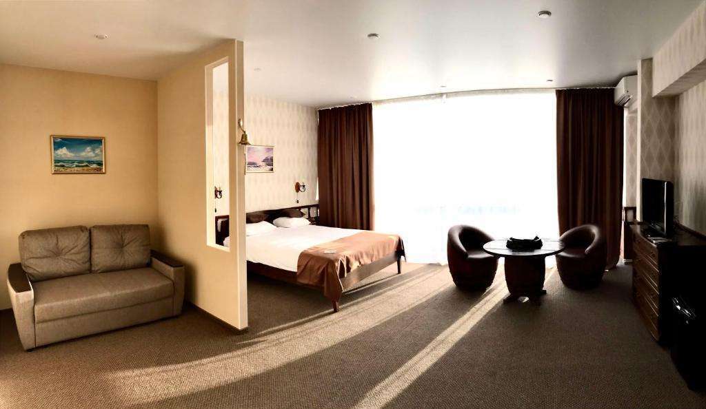 КАЖДЫЙ НОМЕР ИМЕЕТ НЕПОВТОРИМЫЙ СТИЛИЗОВАННЫЙ ИНТЕРЬЕР. Уютные номера с просторной гостиной-спальней, большой кроватью и огромными панорамными окнами. Оригинальный стилизованный интерьер создает особую незабываемую атмосферу. Для полного расслабления в номере Романтика, в комнате, предусмотрено джакузи. В номере: телевизор, кондиционер, телефон, мини-холодильник, туалетная комната с ванной, фен, спутниковое ТВ. Для Вашего удобства в номере: халат, тапочки, косметические принадлежности, сумка и полотенца для бассейна и пляжа.